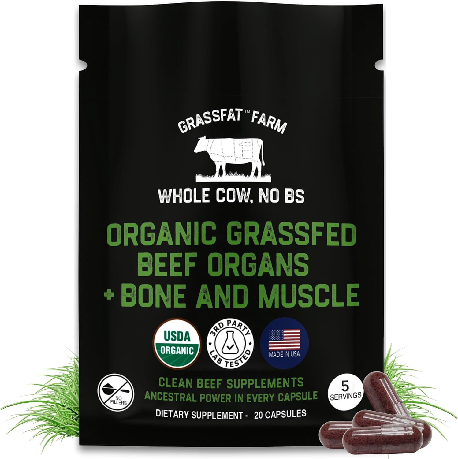 100% Grassfed Cows Beef Organs Supplement + Bone & Muscle - Whole Body Wellness with Vitamin B12 & Proprietary Blend of Liver, Heart, Kidney, Pancreas, Spleen - USDA Organic